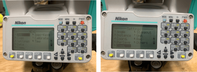 - On the Nikon, ESC out of your settings and menu until you return to the screen displaying the HA, VA, and SD. This screen needs to be displayed before starting the survey on the data collector