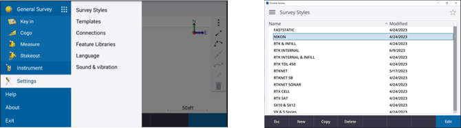 - Go to the three lines or Menu in Trimble Access, Settings, Survey Styles