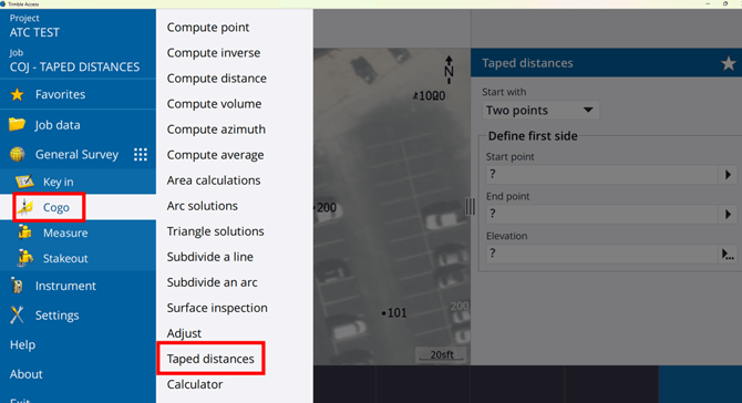 Taped Distances within Trimble Access version 2024.10 has been updated and is a quick and easy way to calculate points on a bearing or azimuth at specific distances from one known point or two known points (previously only two known points). Select the hamburger at the top left and select Cogo then Taped distances.