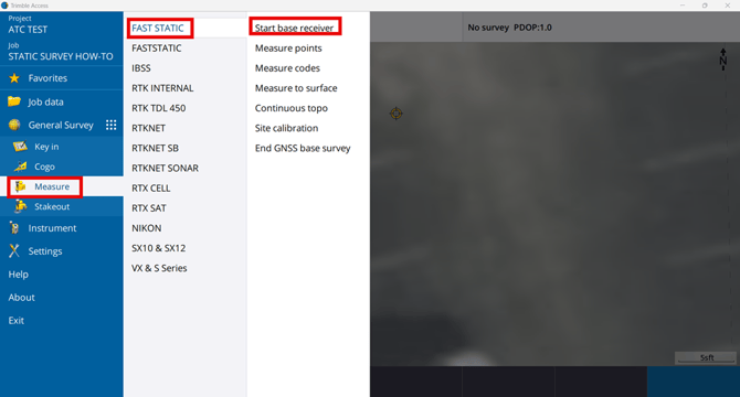 To collect static data, select the three lines at the top left, select MEASURE, then select the STATIC survey style, then START BASE RECEIVER