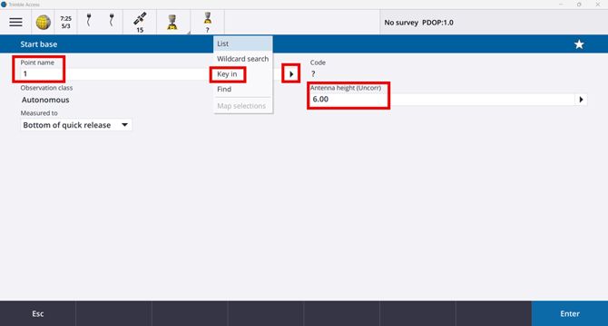 Type in the point name, enter the base antenna height (make sure to measure to the MEASURED TO method), select the arrow to right of the point name, then select KEY IN.