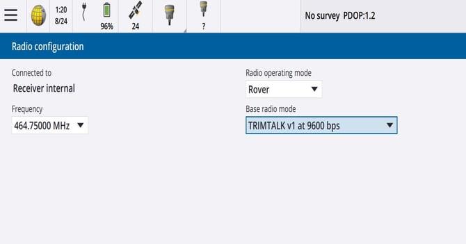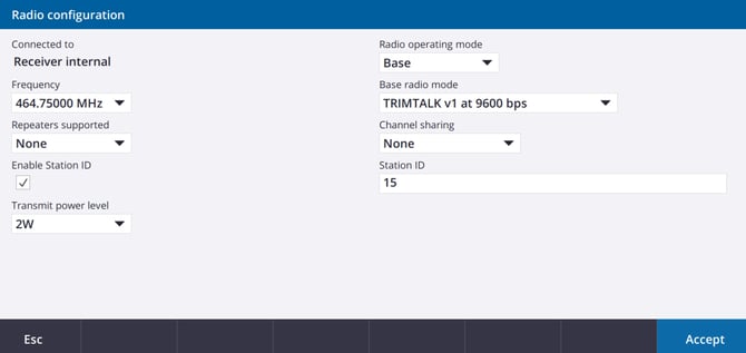 • Select Base for your Radio operating mode and match your Frequency and Base radio mode to your Rover settings. (464.75000 & TRIMTALK v1 9600bps)