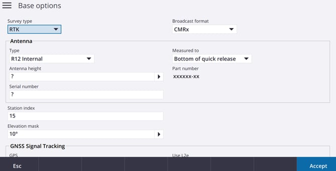• Select Edit on Base Options - Select RTK for Survey type and CMRx for Broadcast format - Select Accept when complete.