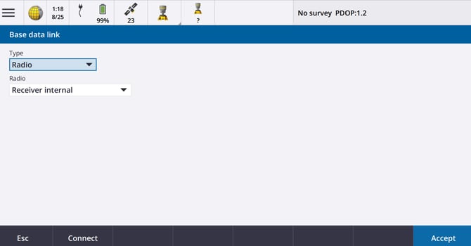 • Select Edit on Base Data Link – Select Radio for Type and Receiver Internal for Radio. Select >Base or Connect when complete.