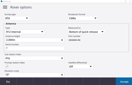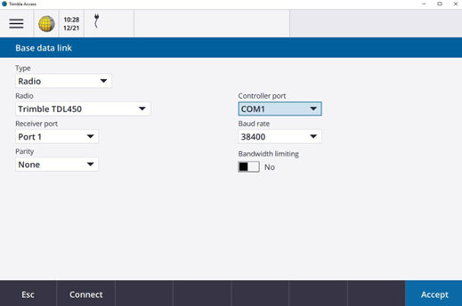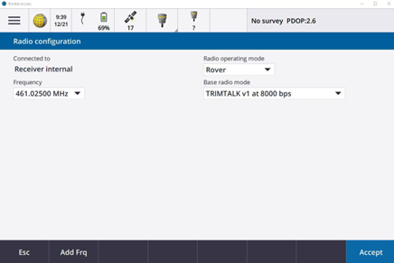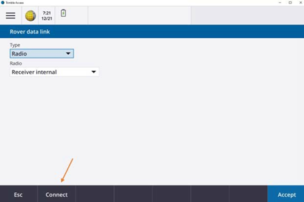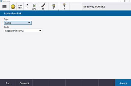7. Type will be Radio and Radio will be Receiver Internal. You will see a “Connect” button at the bottom of the page if you are bluetoothed to your rover. Click “Connect”. Choose your frequency, radio operating mode and base radio mode. Click Accept.