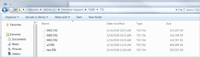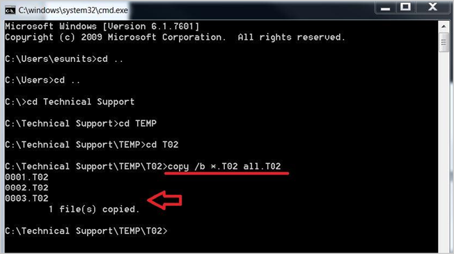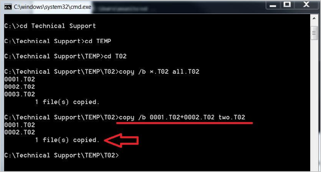 Type Copy /b 001.T02+002.T02 two.T02 and press Enter.